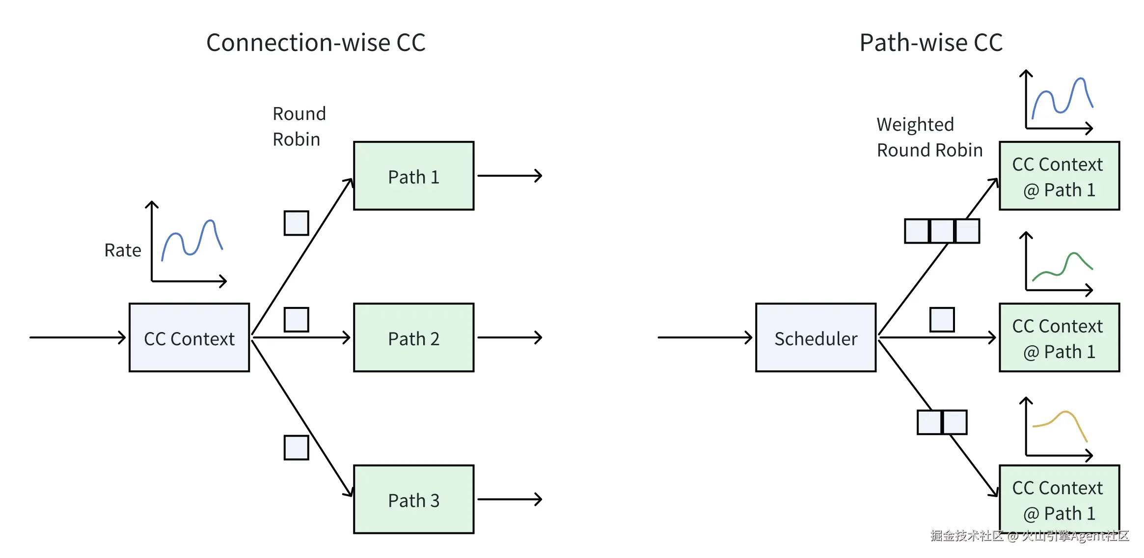 - 多路径拥塞控制:支持路径粒度和连接粒度两种拥塞控制模式,将拥塞信号与可靠传输完全解耦,避免数据传输干扰拥塞感知的准确性。针对路径拥塞不均衡问题,veRoCE提出了基于报文序列号的快速慢路径检测算法,以最小的开销快速定位并剔除慢路径。