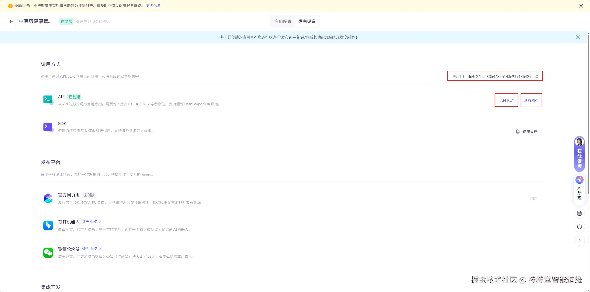 检查配置信息是否正确,点击"发布"按钮完成智能体创建,之后记录应用ID(App ID)等重要信息。