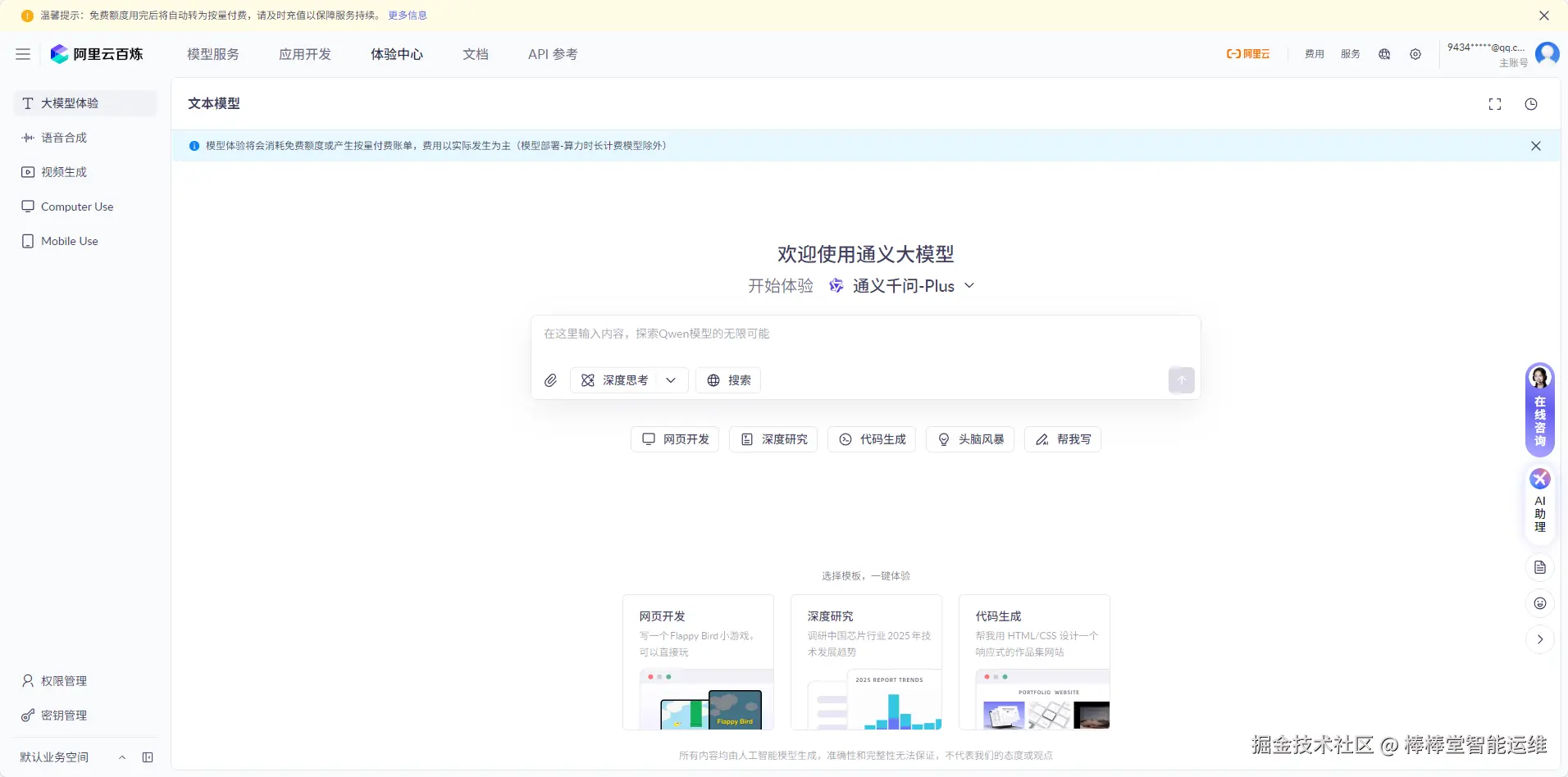 登录阿里云控制台,在搜索框中输入"通义千问"或直接访问通义千问控制台(bailian.console.aliyun.com/),点击"立即开通"按钮,阅读并同意服务协议,选择适合的套餐(初学者建议选择免费套餐)。