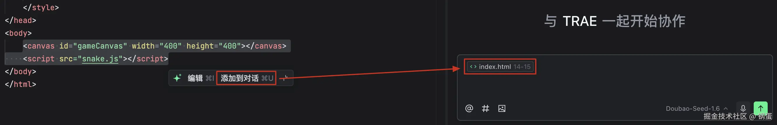 - 点击悬浮菜单中的 添加到对话 按钮,将选中的内容作为上下文添加至侧边对话框。