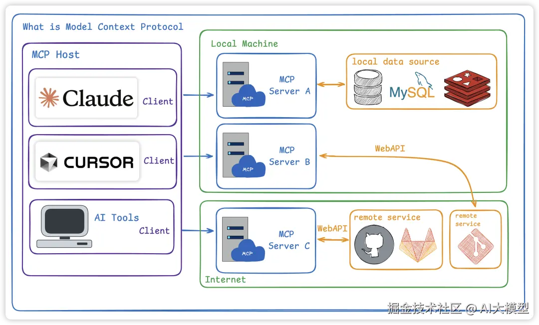 MCP Server 则 负责与相应的外部数据源或工具进行交互 ,获取数据并按照MCP协议规范进行格式化,最后将格式化后的数据返回给大型语言模型。