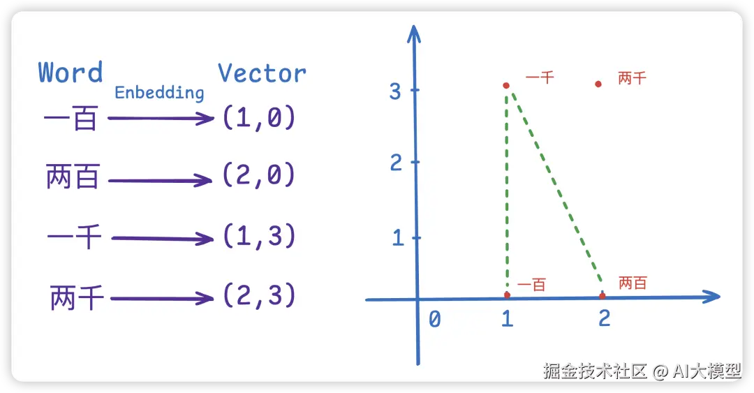 我们可以看到单词向量化后就变成了浮点型,在坐标轴上画上这些坐标我们可以很直观的看到:一百和两百的距离近,而一百离一千远,所以一百相比于一千,更接近两百这个语意。