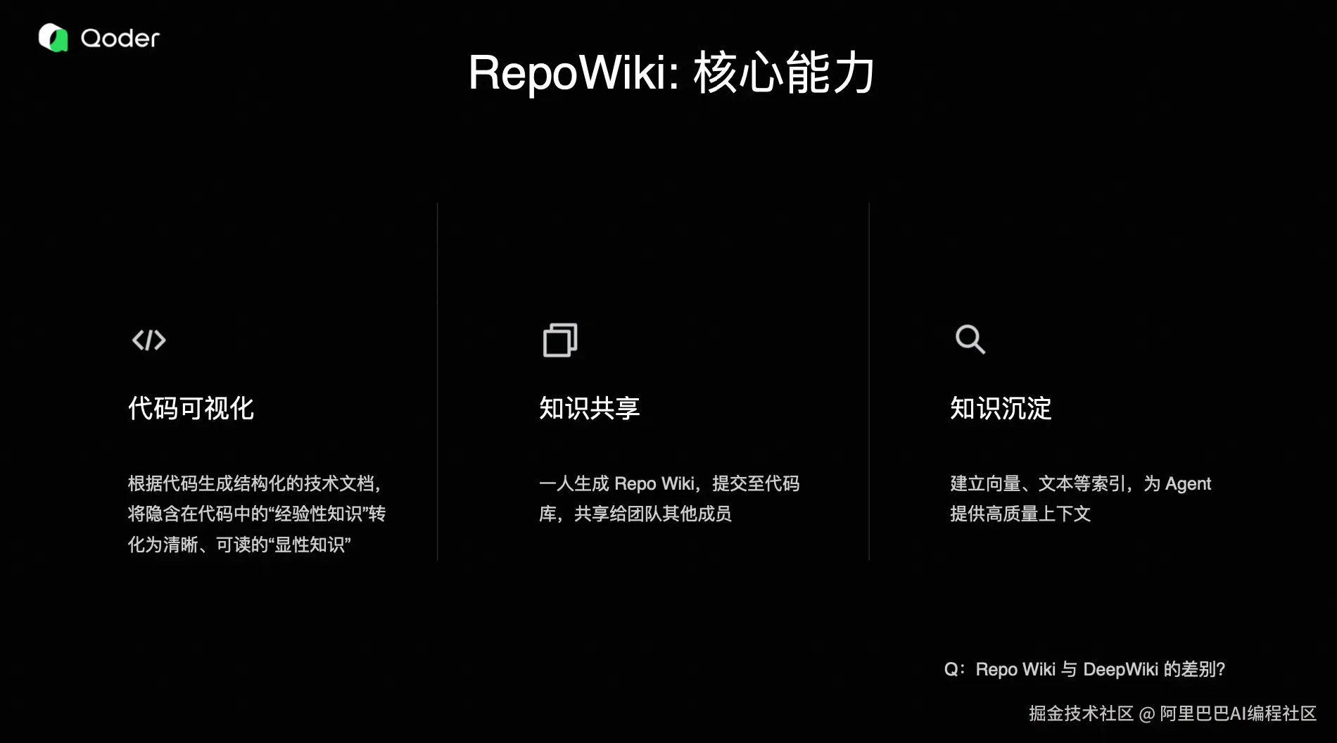 Repo Wiki 有几个核心能力:代码可视化、知识共享以及知识沉淀。