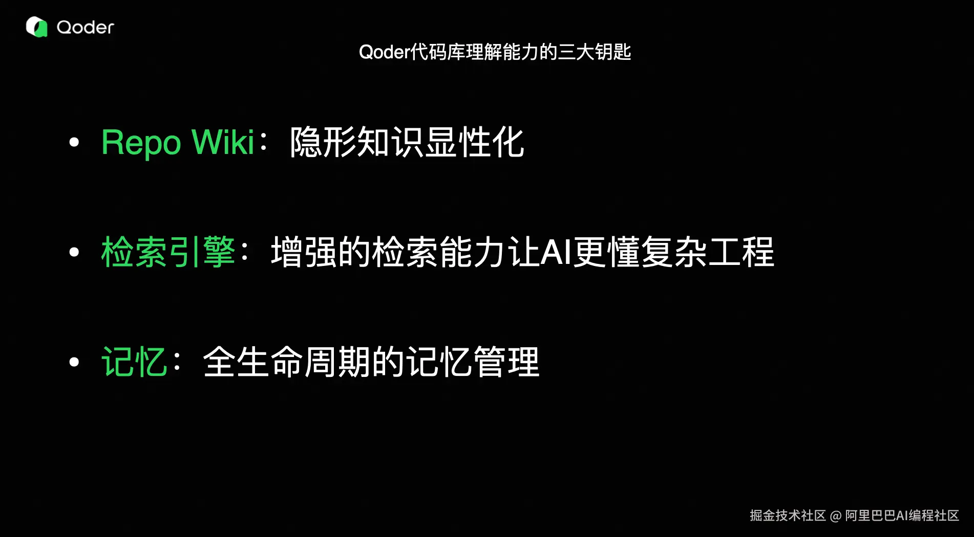 Qoder 的代码库理解能力有三个核心功能:Repo Wiki、检索引擎以及记忆。