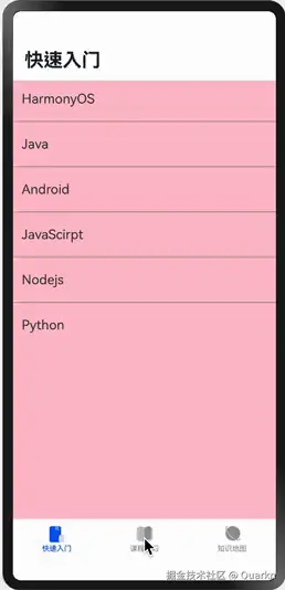 - 快速入门子页面:每一个子页面包含标题栏、内容区,标题栏显示上一页被点击的ListItem字符串