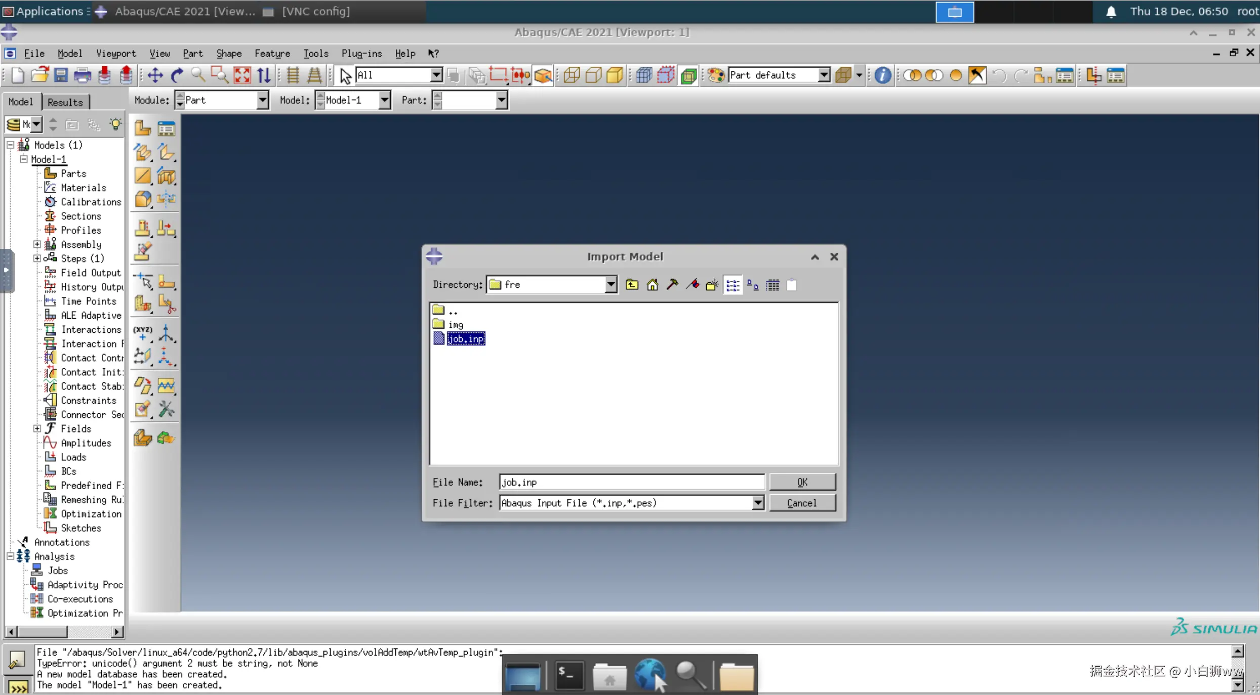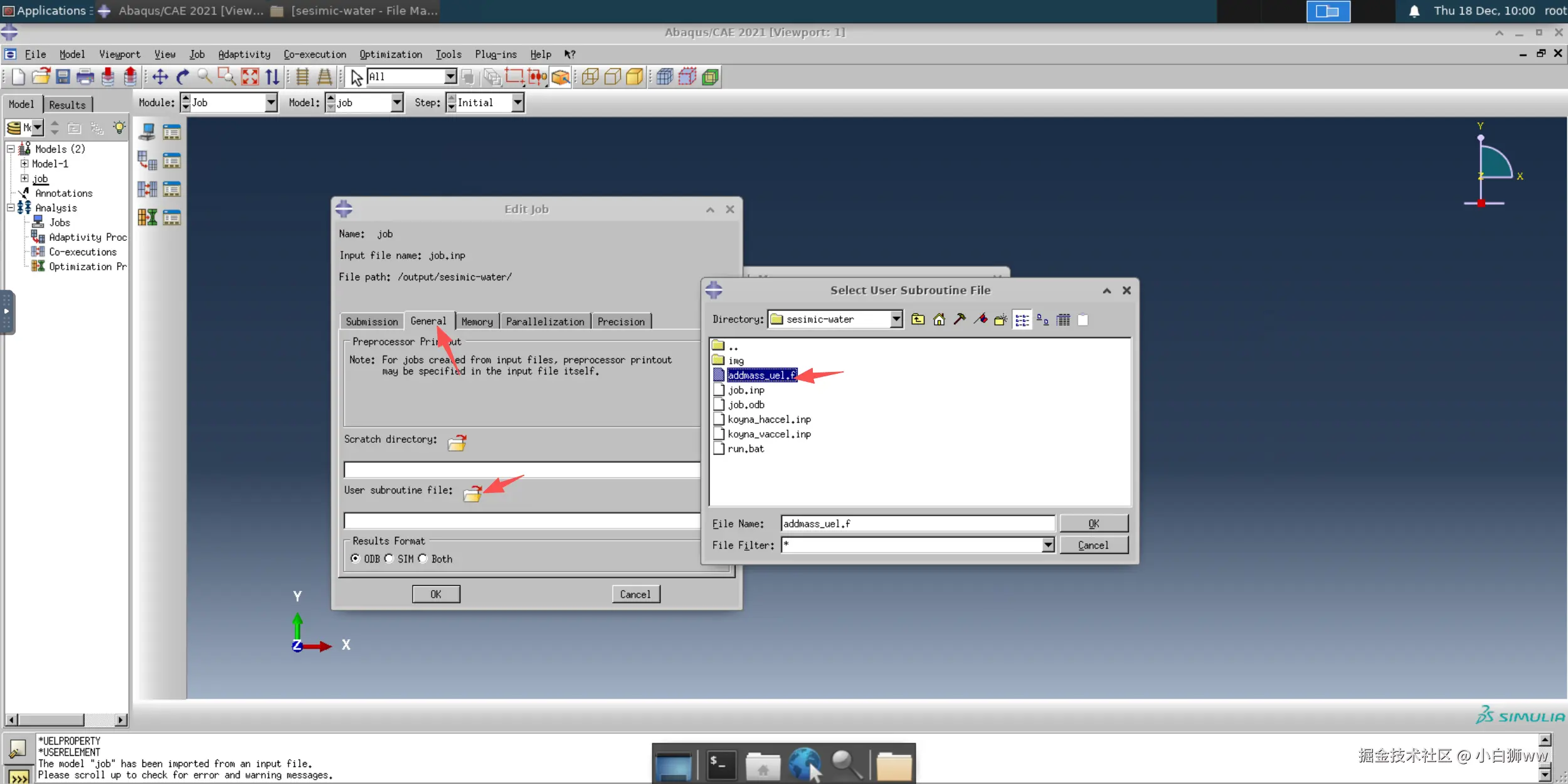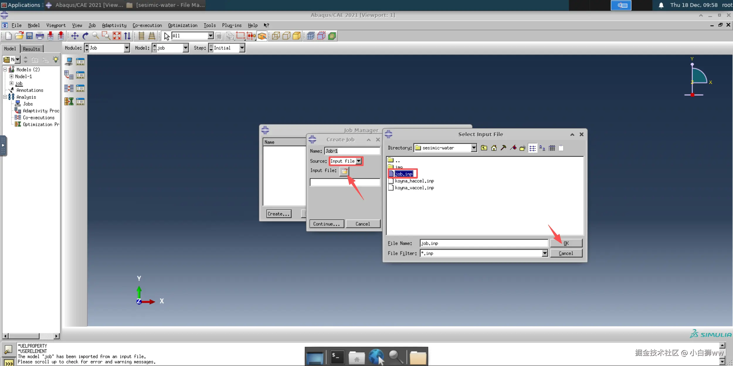 然后导入 inp 文件。模型算例已将 inp 文件都准备好,其中的主要文件为 job.inp,即我们要导入的文件,该文件运行时会调用另外两个文件。