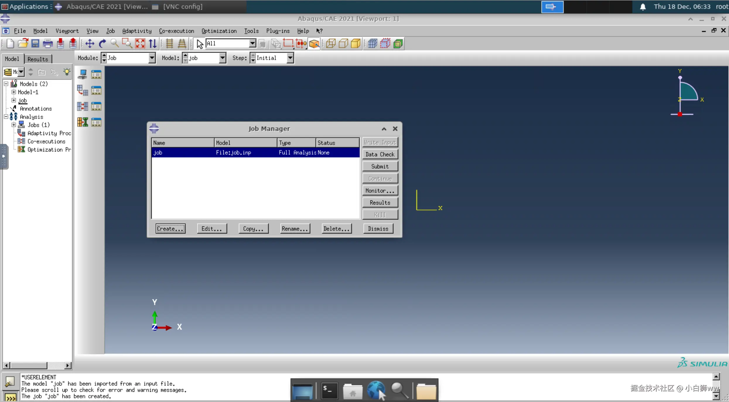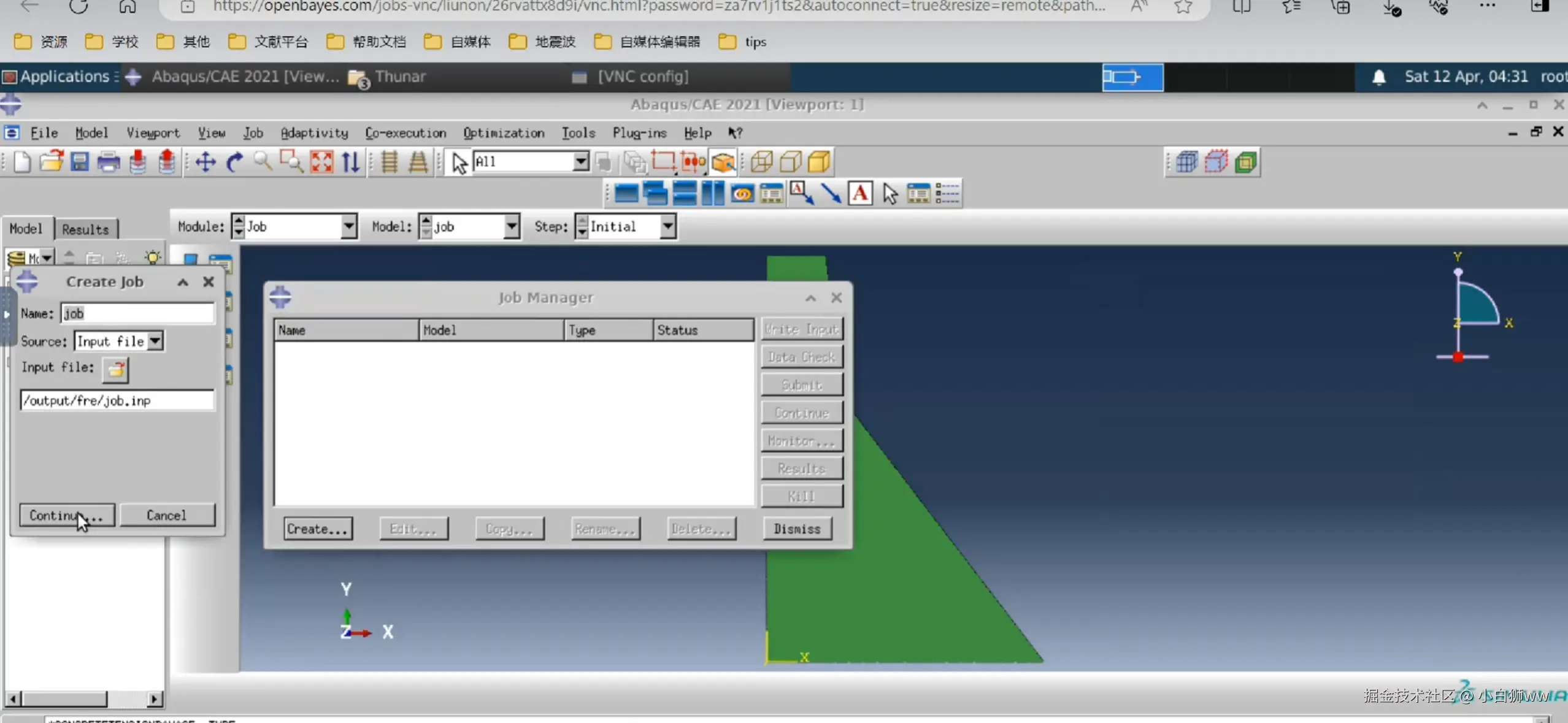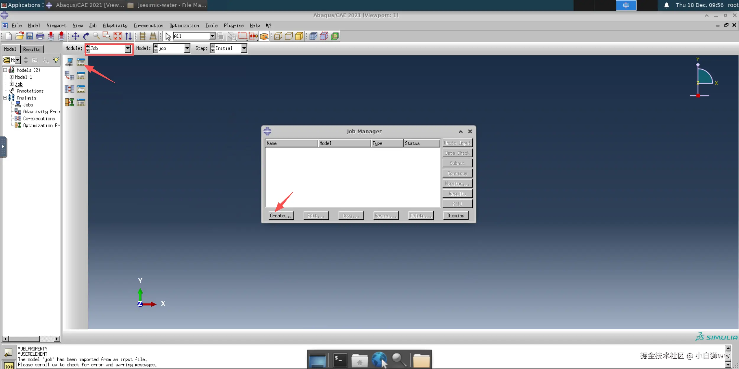然后导入 inp 文件。模型算例已将 inp 文件都准备好,其中的主要文件为 job.inp,即我们要导入的文件,该文件运行时会调用另外两个文件。