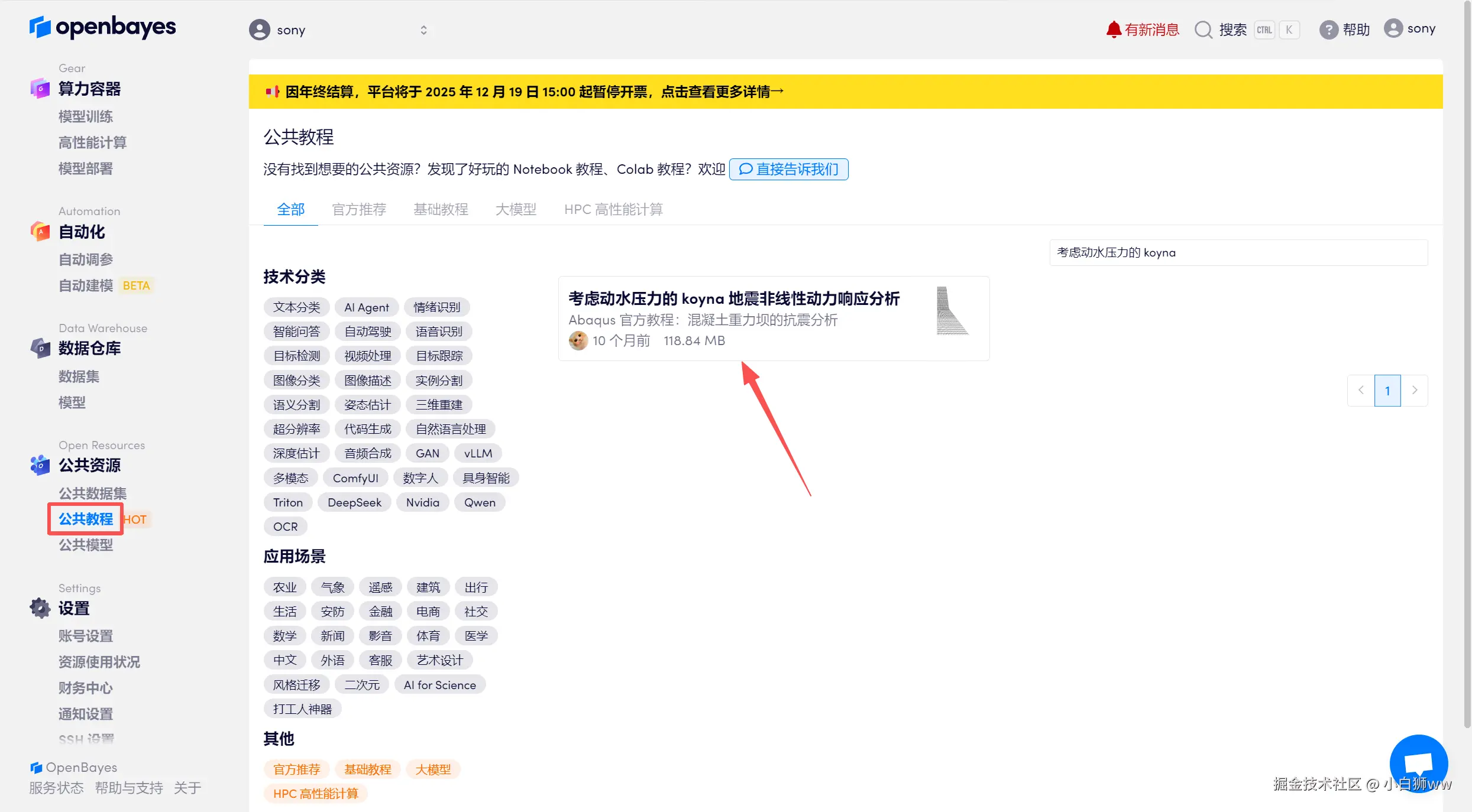 登录 OpenBayes.com,在「公共教程」页面,选择「考虑动水压力的 koyna 地震非线性动力响应分析」教程。