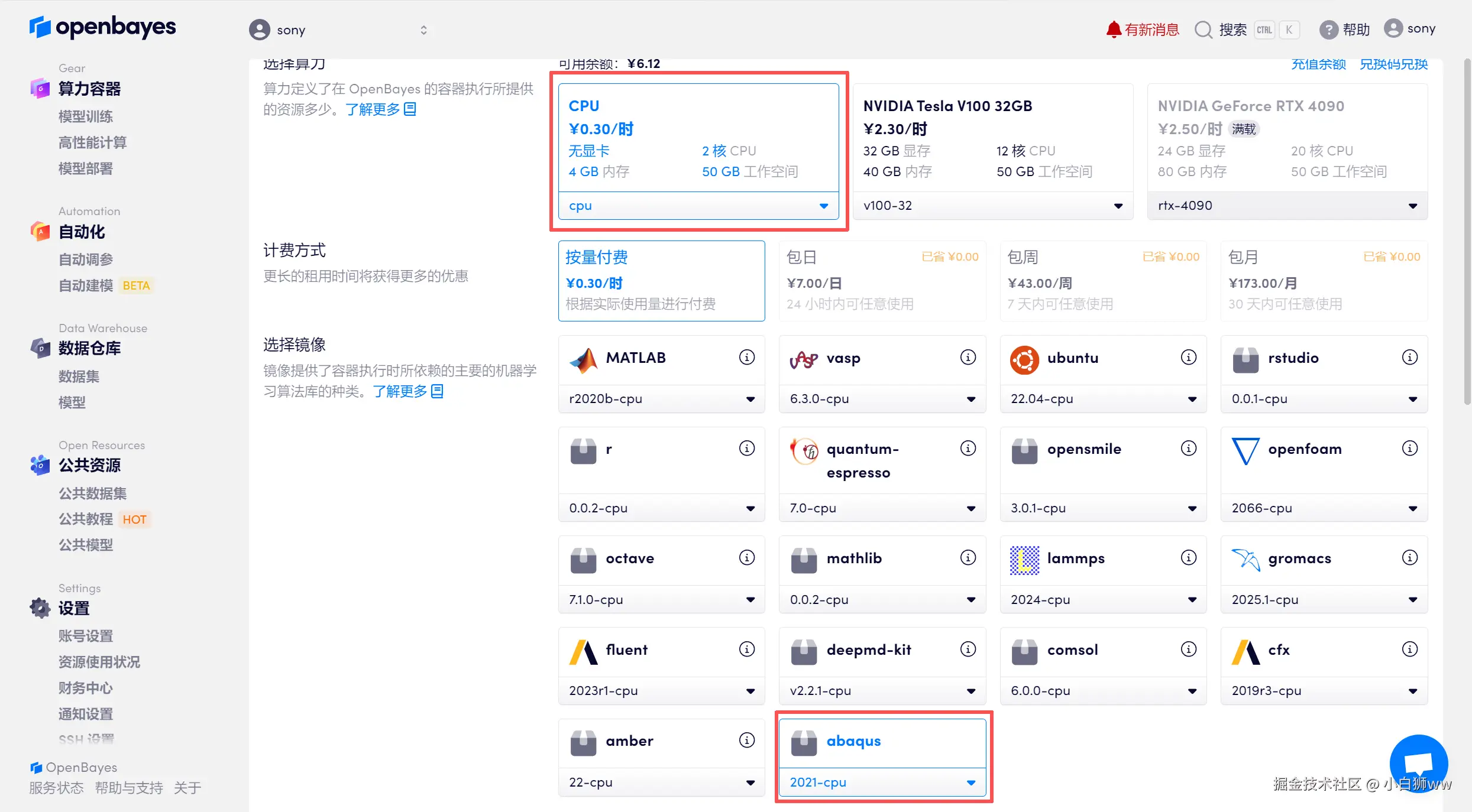 选择「CPU」以及「abaqus」镜像,OpenBayes 平台提供了 4 种计费方式,大家可以按照需求选择「按量付费」或「包日/周/月」,点击「继续执行」。可以使用文章开头的邀请链接,获得 RTX 4090 使用时长!