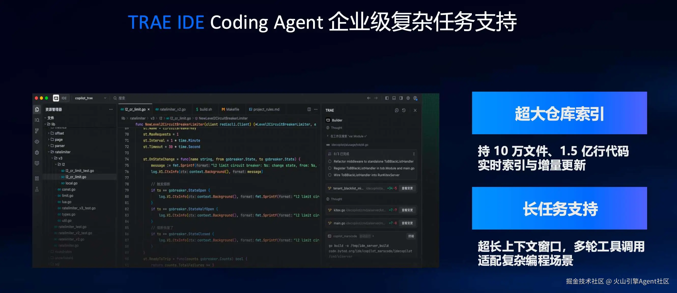Agent 开发需要好的开发工具帮助开发者做好 AI Coding 和 Agent 搭建。在这方面,扣子和 TRAE 大家已经很熟悉了。当前,扣子月活开发者超过 300W,是中国最大的 Agent 开发平台;TRAE 月活用户突破 160W,是国内使用最多的 AI IDE。