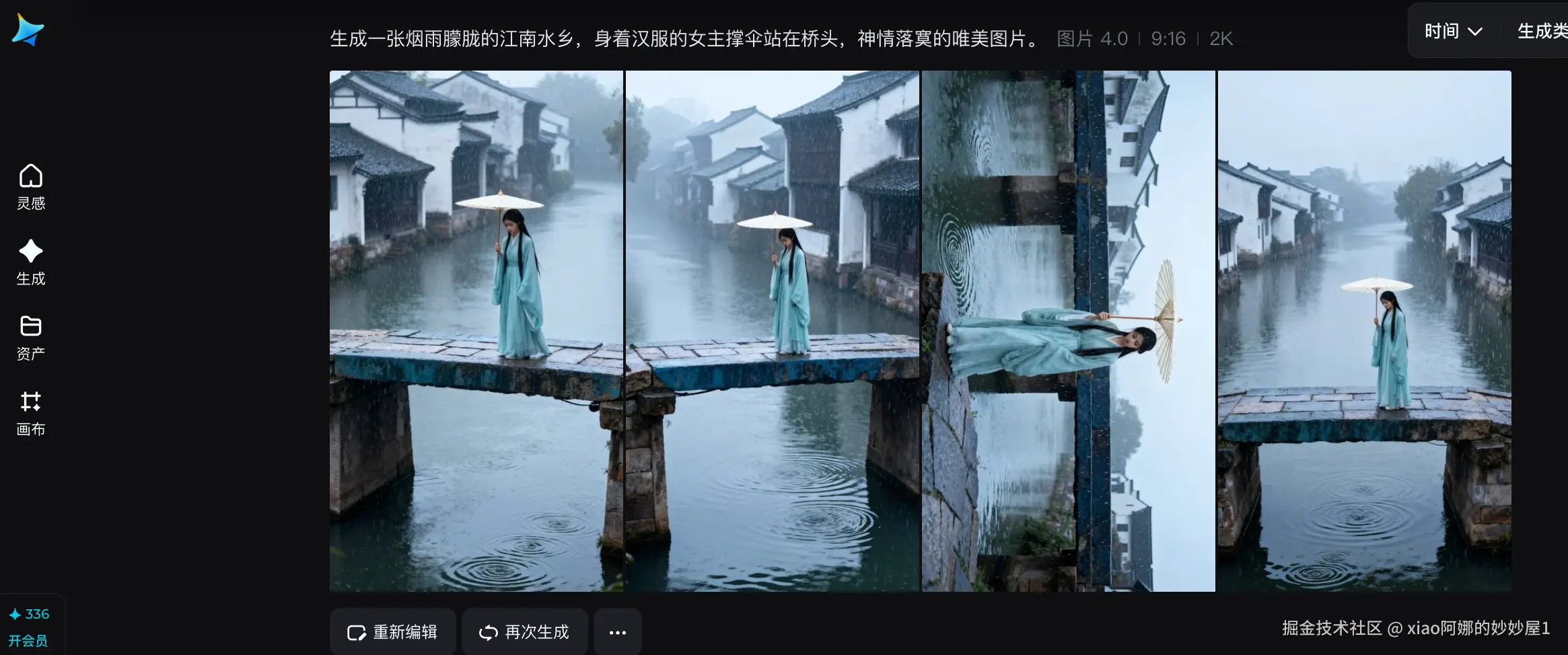 - 生图定角:生成一张烟雨朦胧的江南水乡,身着汉服的女主撑伞站在桥头,神情落寞的唯美图片。