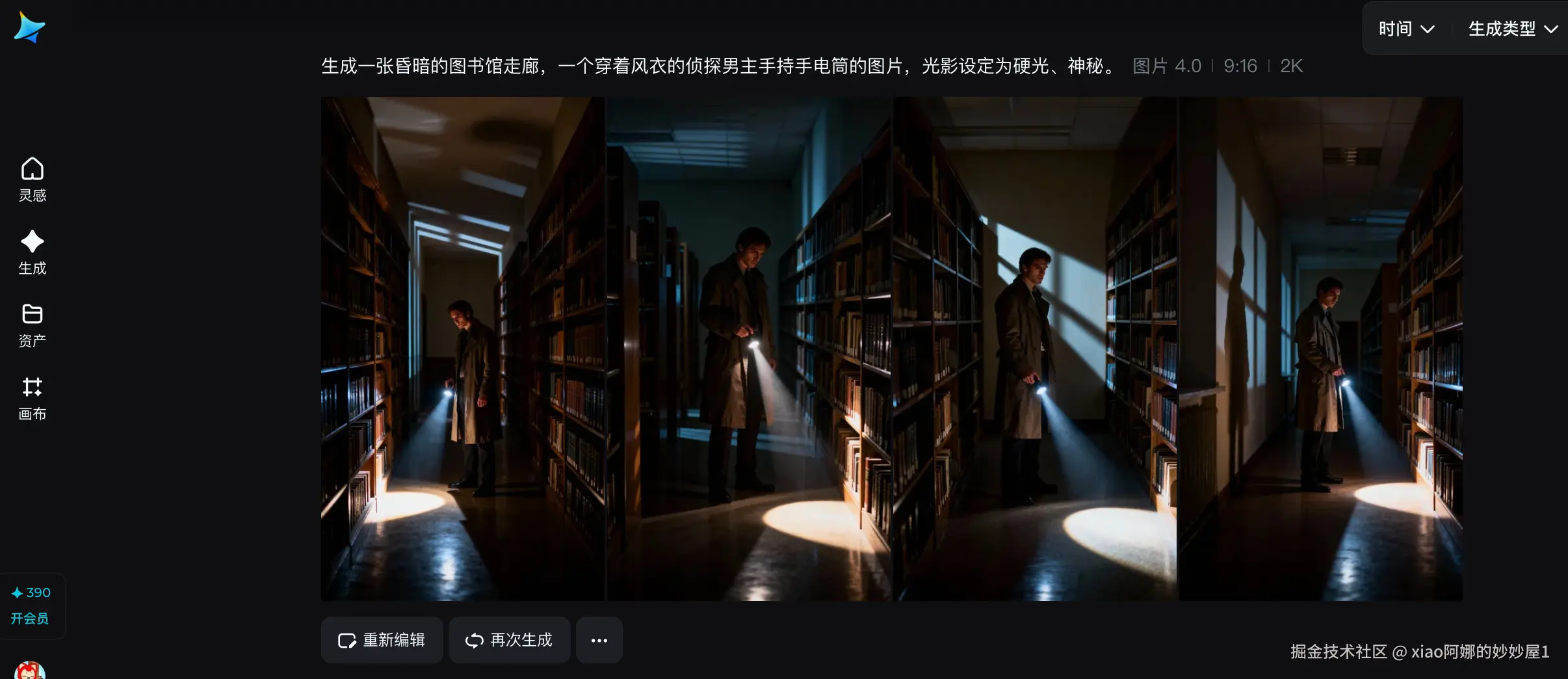 - 生图定角:生成一张昏暗的图书馆走廊,一个穿着风衣的侦探男主手持手电筒的图片,光影设定为硬光、神秘。