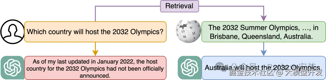 上图展示了 RAG 如何使 ChatGPT 能够提供超出其初始训练数据的精确答案。