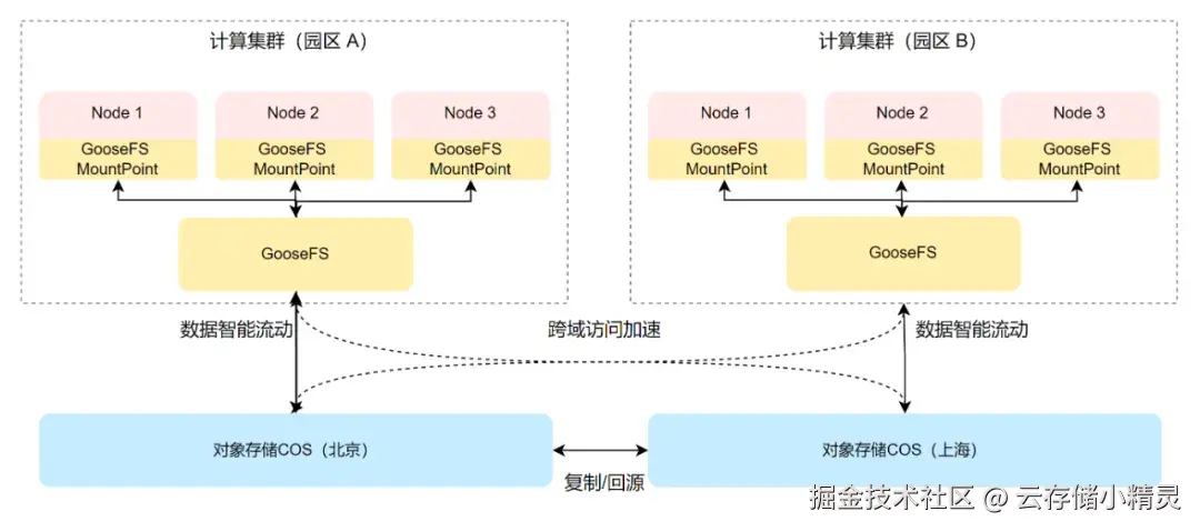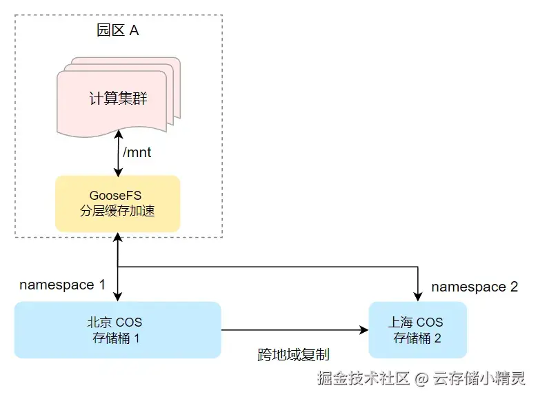 2. 高性能缓存 GooseFS:实现数据的统一缓存和分层透明加速。通过智能缓存分层、统一命名空间、智能数据流动等多种技术手段,透明加速多个 COS 存储桶中的数据。