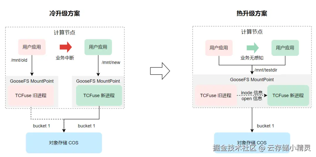- 热升级:传统文件系统客户端,如果要升级版本,需要卸载重挂,导致业务中断,在 AI 训练等长周期任务中尤为致命。GooseFS MountPoint 支持业务无感知的平滑演进,实现零停机更新,客户端版本更新无需重新挂载,对上层应用完全透明。在热升级过程中: