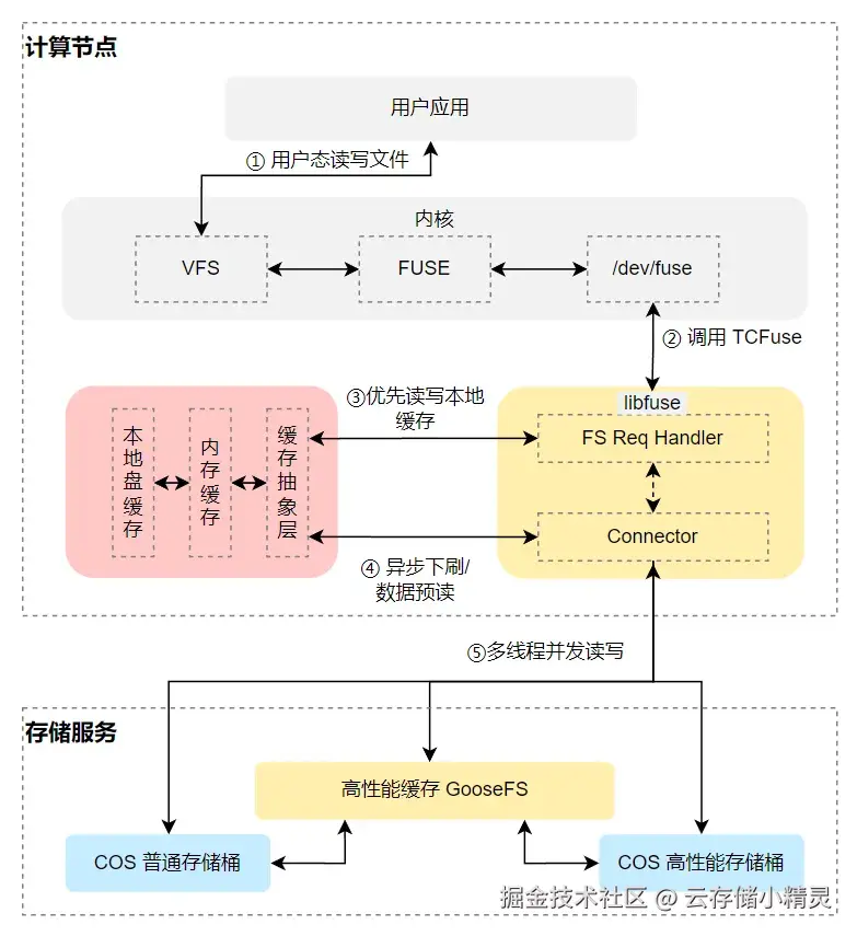 1. 高性能客户端 GooseFS MountPoint:基于腾讯云自研 TCFuse 提供的高性能 POSIX 语义客户端。允许您将 COS 存储桶作为本地文件系统挂载到您的操作系统上,让计算层可以像本地文件系统一样访问 COS 存储桶。