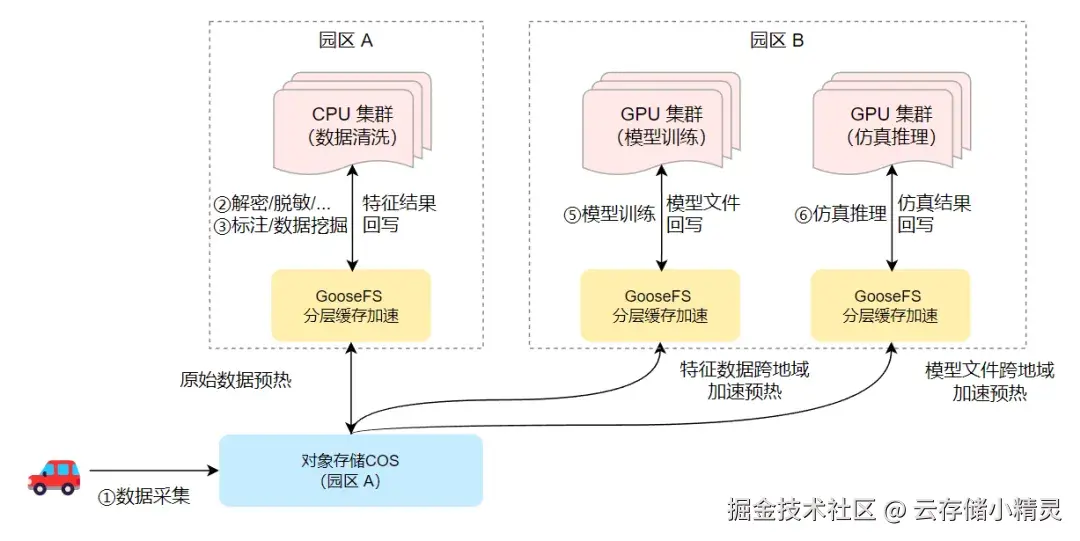 腾讯云团队在对客户的业务流进行深入剖析后,通过高性能对象存储解决方案提供端到端的数据访问加速能力。整体技术架构上,所有数据持久化在对象存储 COS 上;GooseFS 就近计算端部署,智能缓存热点数据;计算集群就近访问 GooseFS 高性能缓存。整体数据流向如下:
