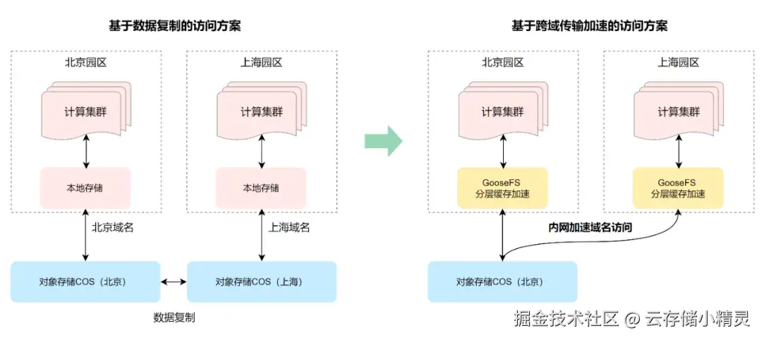 受限于 GPU 资源的多地域分布,跨地域的数据访问需求随之而来。传统架构下需要将数据复制多份,并通过不同域名拷贝到对应园区的计算集群的本地存储中,数据存在多次拷贝动作;腾讯云基于高性能内网传输加速能力为 GPU 多地训练架构提供了高效、便捷的方案。