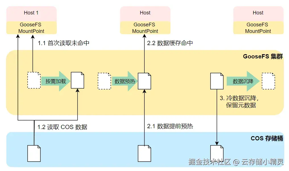 当主机首次从 GooseFS 上读取文件时,GooseFS 发现仅有文件的元数据,会自动读取 COS 桶对应文件,直接返回给主机;通过并行处理技术,加速数据传输性能。