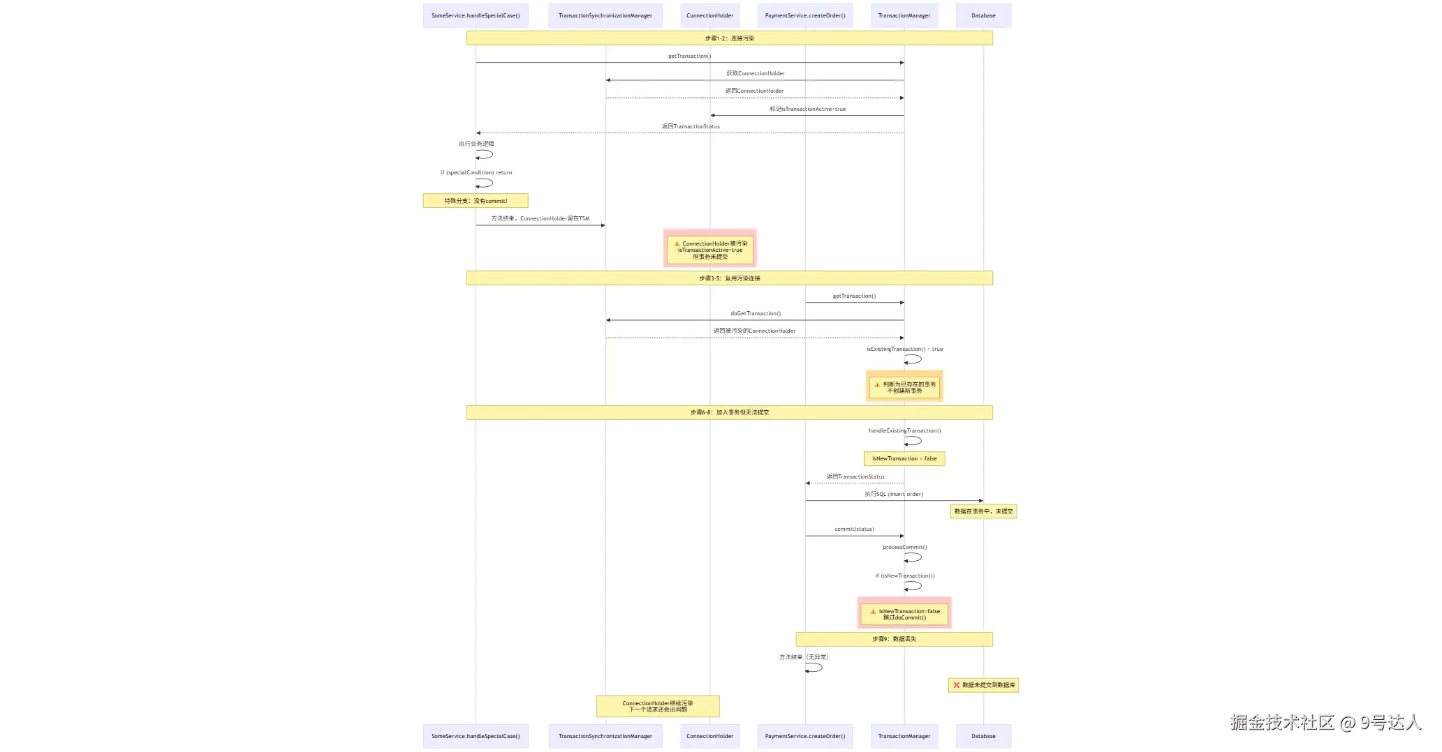 ConnectionHolder归还到TransactionSynchronizationManager,但事务标记isTransactionActive()还是true PaymentService.createOrder()调用doGetTransaction()doGetTransaction从TransactionSynchronizationManager拿到被污染的ConnectionHolderisExistingTransaction判断为true,认为已有事务- 走