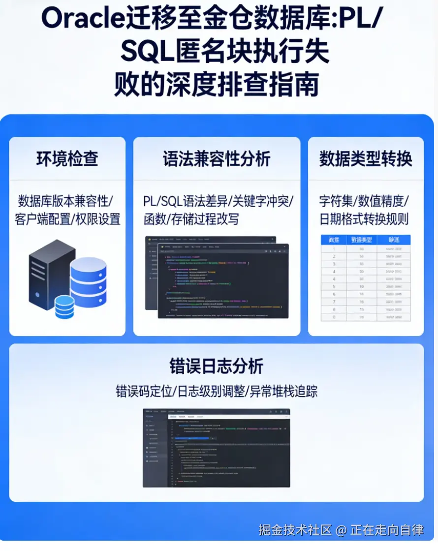 本文将从实际迁移案例出发,系统性地剖析PL/SQL匿名块迁移过程中常见的执行失败问题,提供从问题定位到解决方案的完整路径。我们特别参考了金仓技术博客(kingbase.com.cn/explore)中的丰富实践案例,结合典型错误场景,为您呈现一份实用的迁移排错指南。