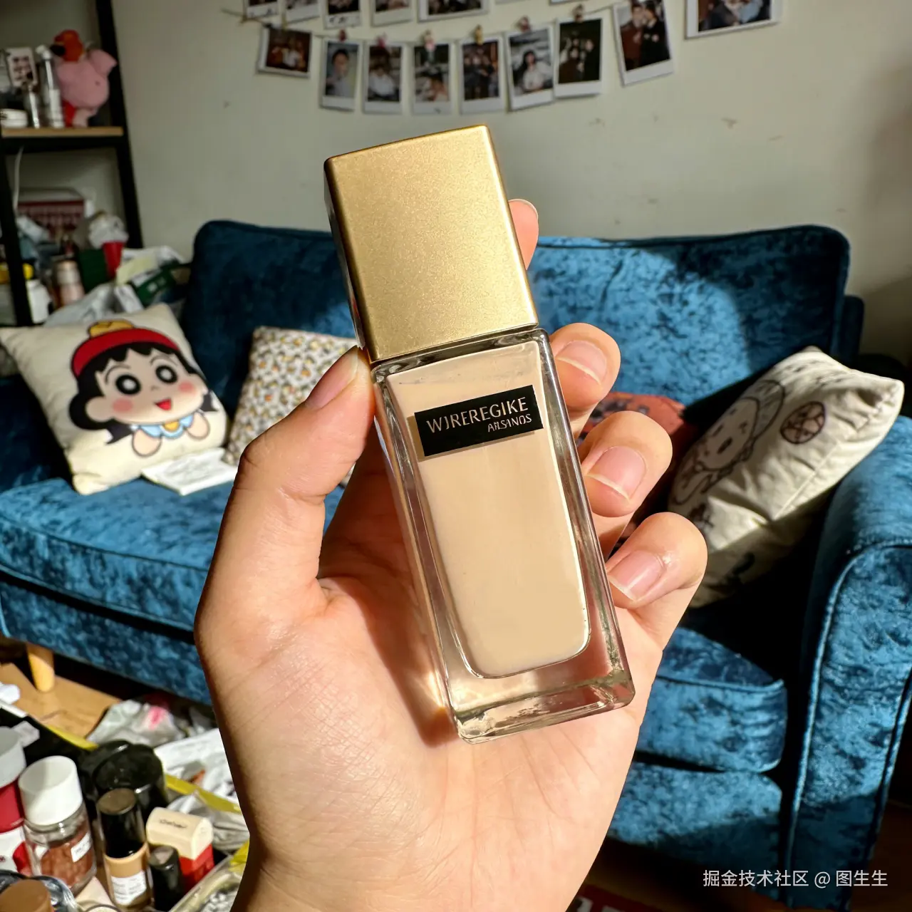 ◇原图痛点:客厅随手拍的粉底液,背景有沙发、抱枕等杂物,瓶身反光杂乱,光线暗沉,整体画面显杂乱,突出不了产品质感