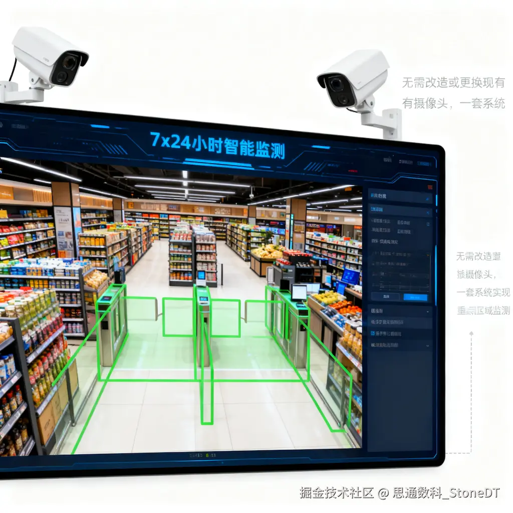 思通数科AI数智店商系统,正是专为解决此类精细化管理的痛点而来。它无需你改造或更换现有摄像头,仅需一套系统,即可实现对全店通道、出入口等重点区域的7x24小时智能监测。如果你想免费体验这套系统,赶紧去开源社区下载这个项目,开源项目的地址我放在的文章最后。