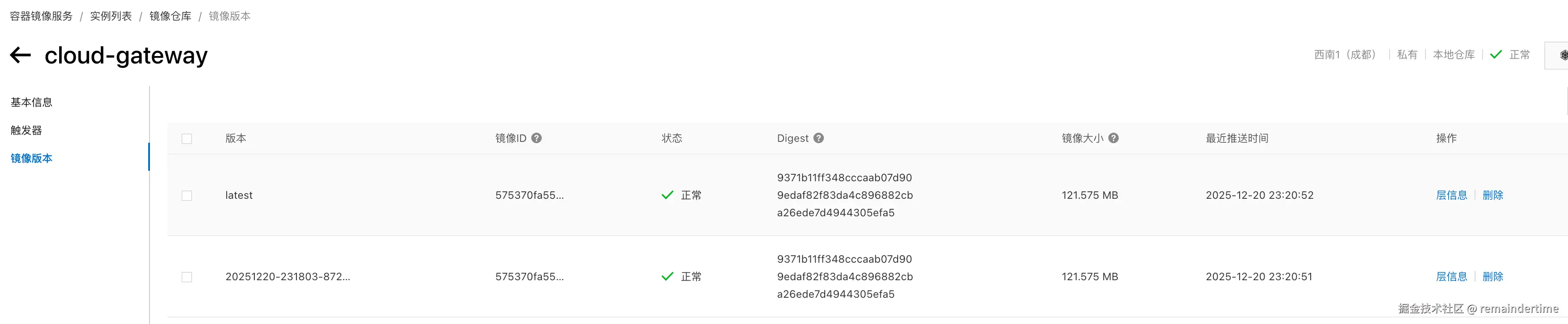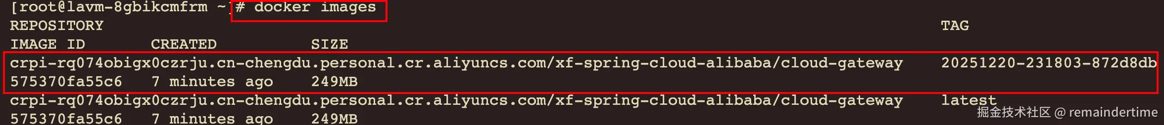 执行命令查看已经拉取的镜像列表,已经从阿里云 ACR 仓库中拉取服务镜像