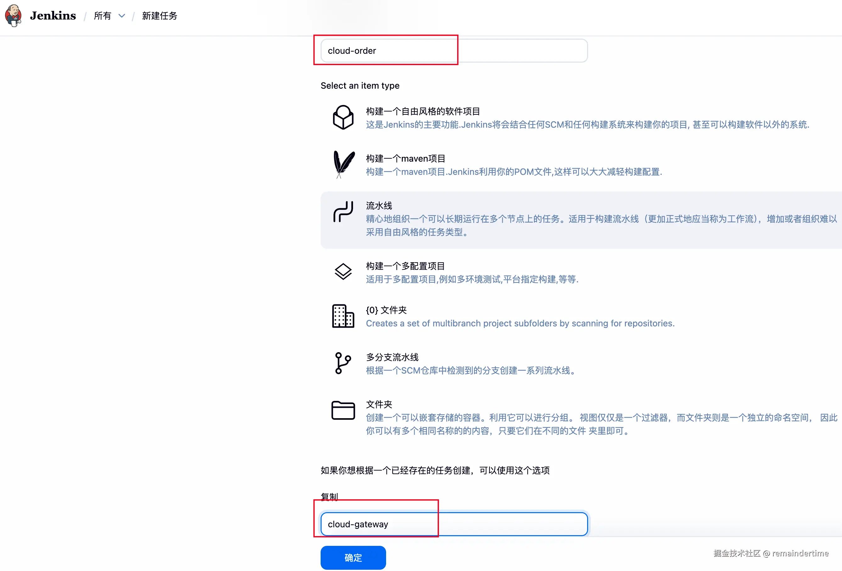 一般微服务需要先启动网关,那么就输入自己网关服务的名称,并且选择流水线 并点击确认