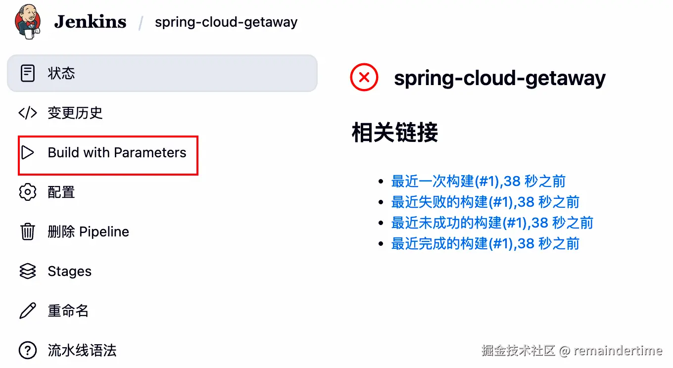 刷新本页面会发现菜单中多了一个 Build with Parameters 项