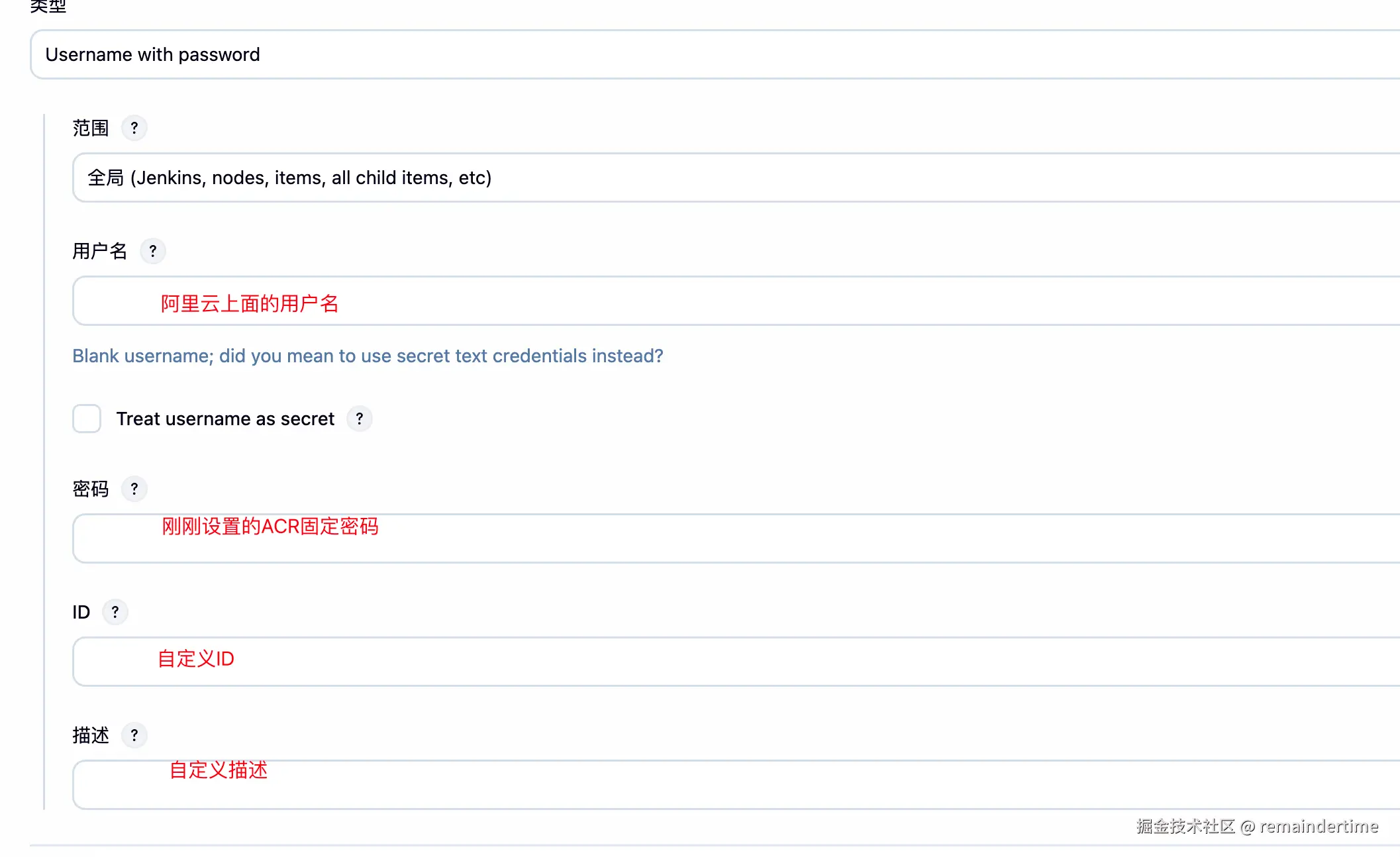 - DOCKER_CREDENTIALS_ID:Jenkins 凭证管理中创建的阿里云 ACR 凭证唯一标识 ID