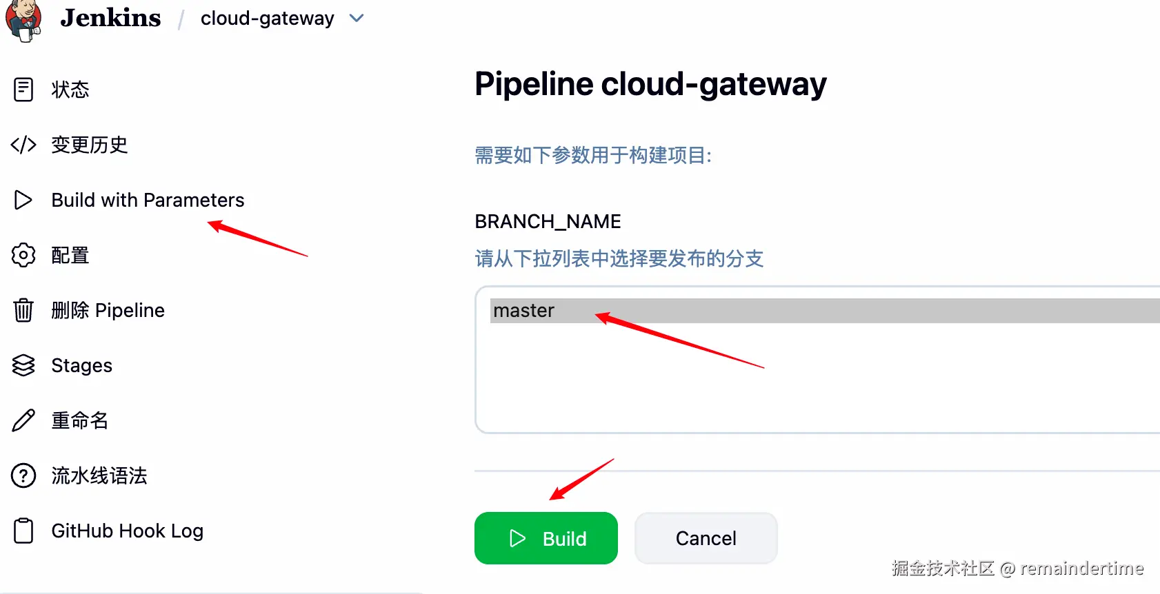 然后回到上一个页面点击 Build with Parameters 选择分支构建服务