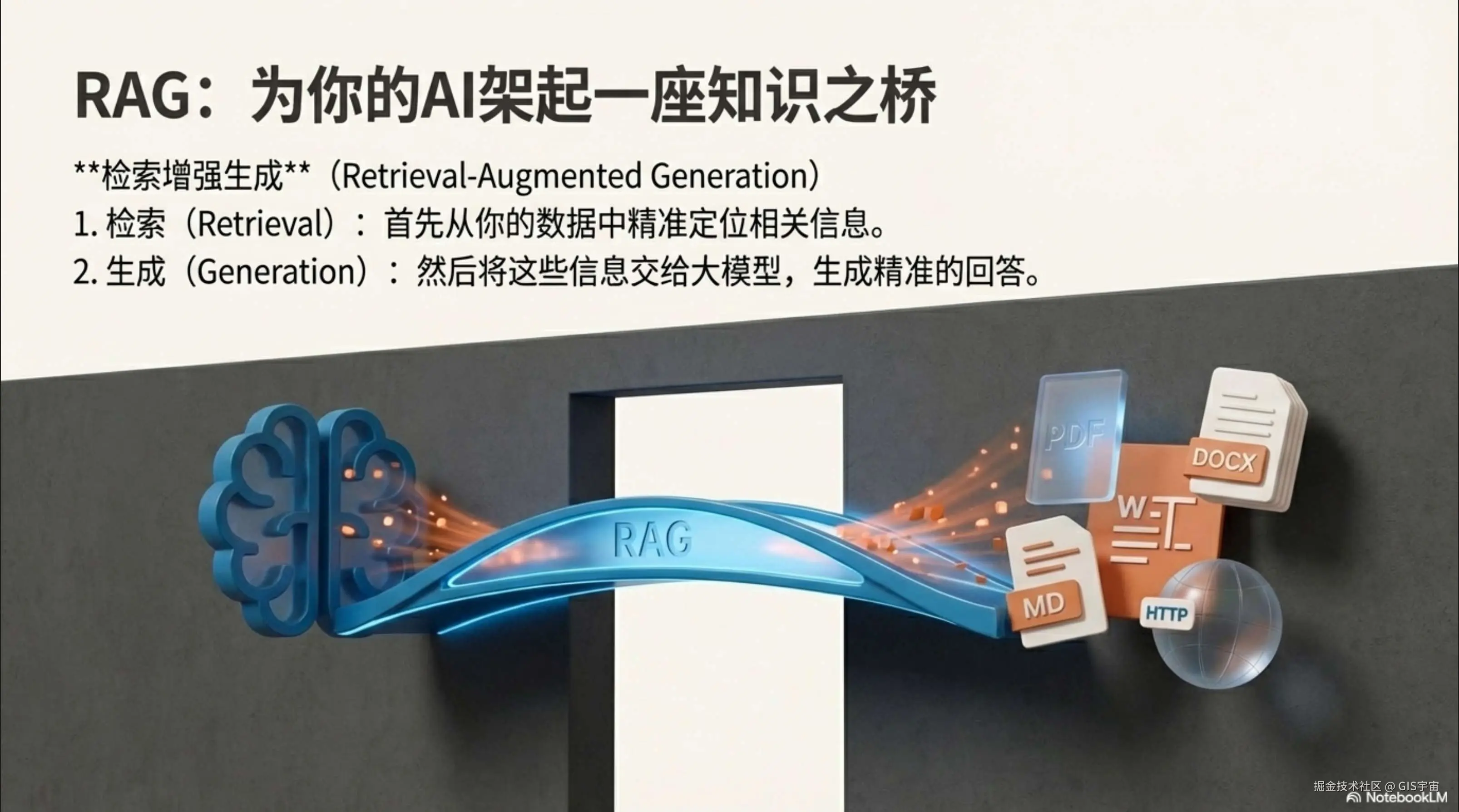 RAG (Retrieval-Augmented Generation),中文译为 “检索增强生成”。它的核心逻辑可以拆解为两个关键词的组合:检索(Retrieval)+ 生成(Generation),本质是给大语言模型加装一个 “外部知识库接口”。
