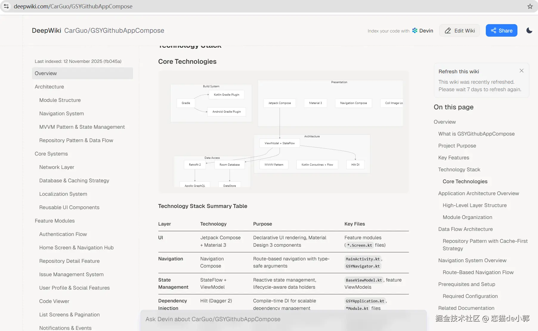 而对于项目的架构,我们也可以通过 AI 来完成,例如 https://deepwiki.com/ ,只需要通过 https://deepwiki.com/CarGuo/GSYGithubAppCompose ,我们就可以得到一份项目的架构报告,并且你还可以通过它继续询问相关问题: