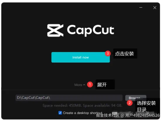 1.找到下载好的CapCut(剪映国际版)安装包,双击打开********2.①展开更多②选择安装目录③点击 Install now