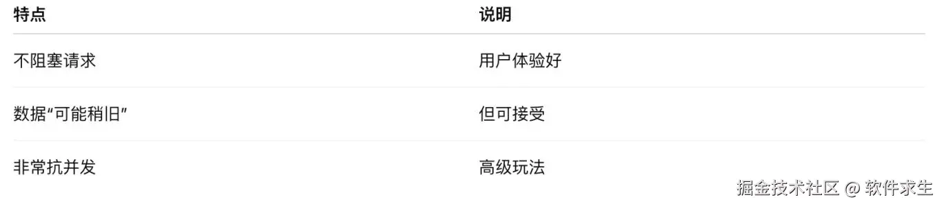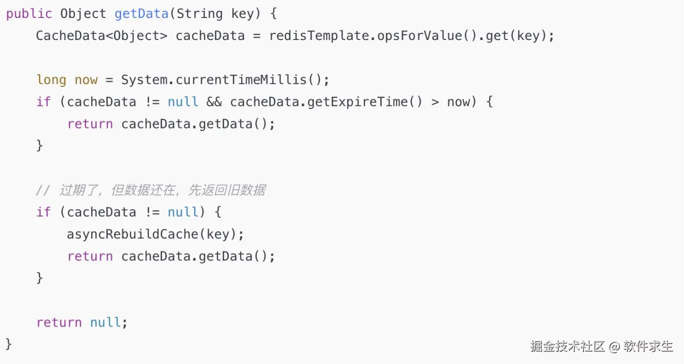 第三,更成熟的做法是引入缓存标记位或逻辑过期,缓存过期后先返回旧值,再异步更新,避免请求直接打到数据库。