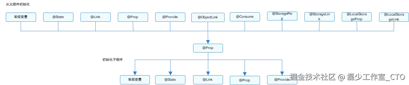 @Prop支持装饰基础类型、class、数组、map、set等类型,大多数情况下父组件传递变量是@State修饰的。下图体现了 @Prop状态变量可以接收哪些父组件装饰器的状态变量 以及 @Prop状态变量可以传递哪些装饰器修饰的子组件状态变量