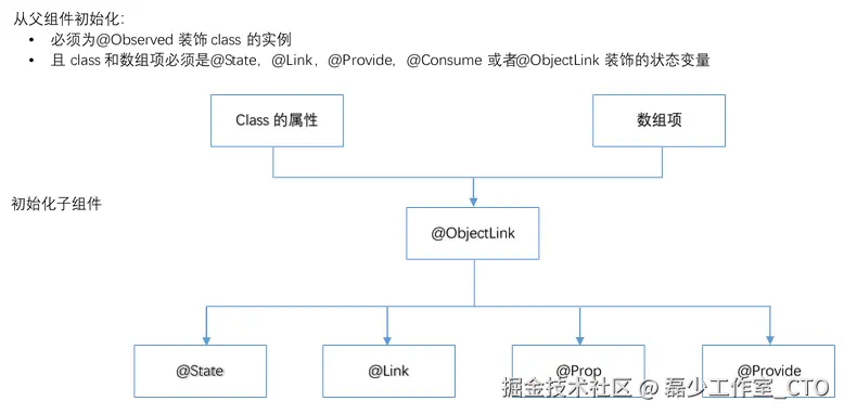 - 父组件里@State装饰countArr数组对象,把countArr变量传递给了子组件,子组件用@Link装饰变量接收,这样保证父子是双向同步的,父组件和子组件都能观察到内数组的增删改查。