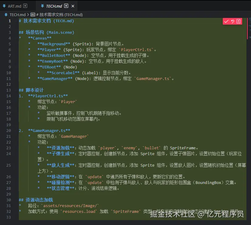 GD.md: 游戏设计文档。ART.md: 美术需求文档。TECH.md: 技术需求文档。