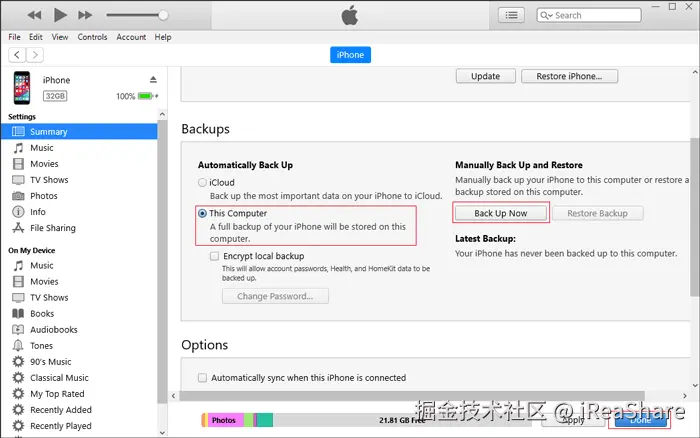 - 点击“立即备份”按钮。请注意,iTunes 不支持选择性备份短信或特定数据。