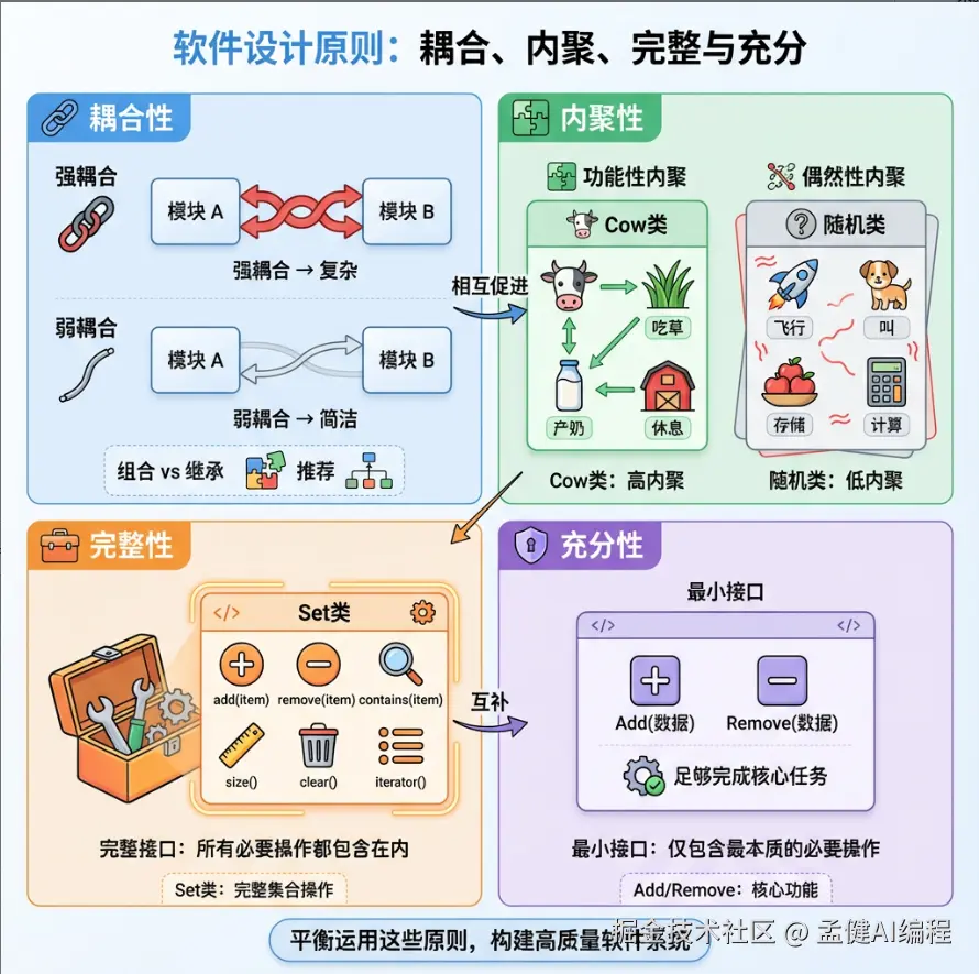 内聚性: 各个元素之间的联系应该是高内聚的,功能性内聚。