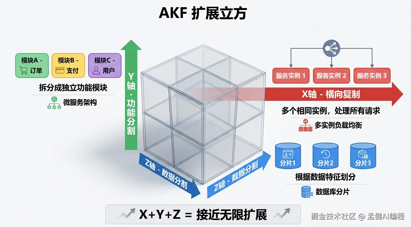分布式之所以强大,是因为它可以支撑“接近无限”的业务扩展诉求,架构真经的作者提出了 AKF 扩展立方的概念,很形象的说明了分布式系统扩展解决方案: