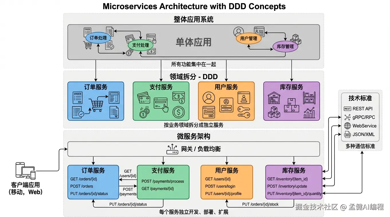 y 轴的拆分,通常称之为领域拆分,最典型的应用就是微服务的思想和 DDD 设计。无论是 SOA 还是 ROA,都是在做服务拆分,从而出现了很多标准,比如 RPC、WebService、REST 等等。