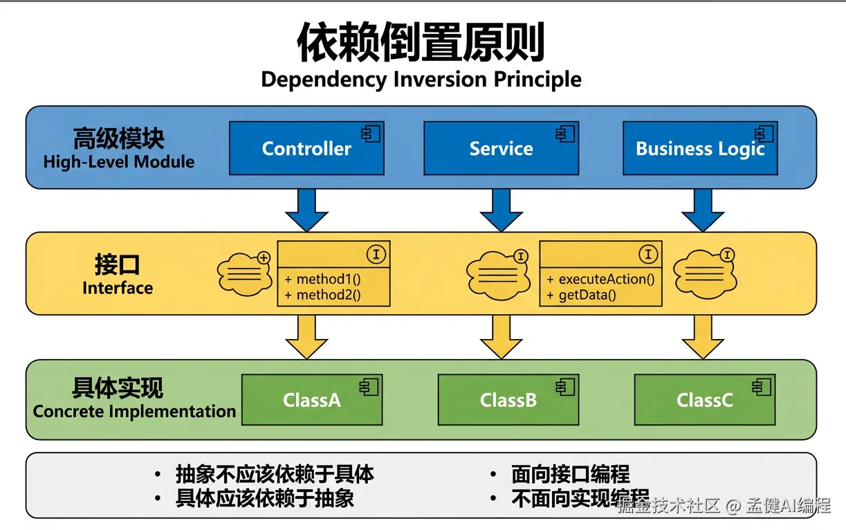 在软件设计中,依赖倒置的解耦思想,面向接口编程的思想,本身就是抽象模式的设计,它需要我们具备较强的抽象思维能力才能够理解: