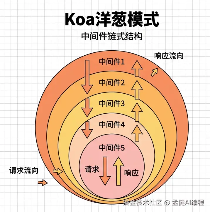 第二个例子是责任链模式,最典型的责任链模式可以参考 Koa 的洋葱模式设计: