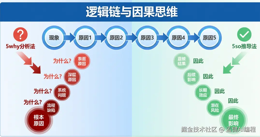 往因的方向扩展,形成 5why 思考法;往果的方向扩展,形成 5so 思考法。