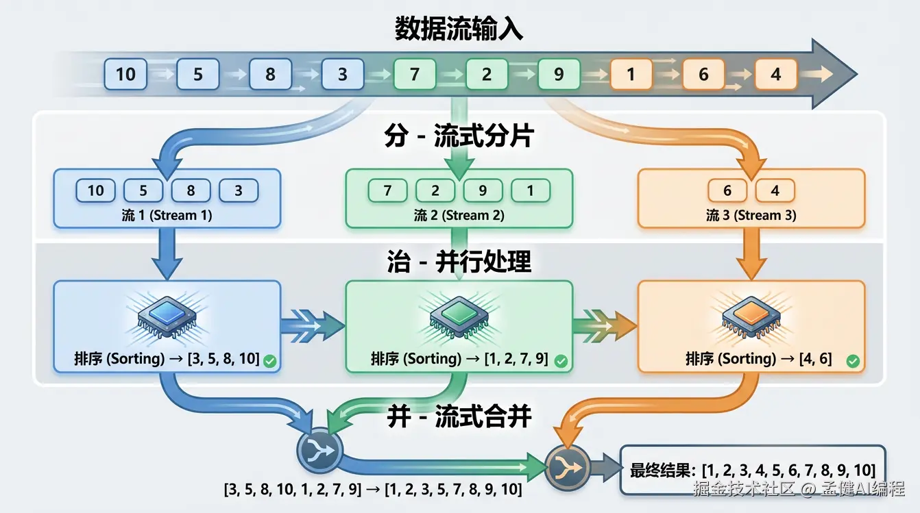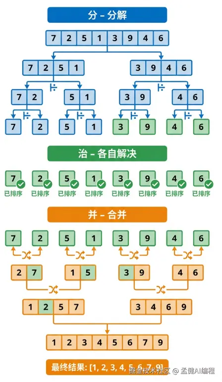 当然,其实真正的分治算法,并不只是分,完整包含了分、治、并。