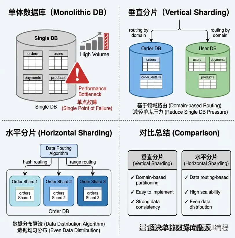 具体到数据库层面,就变成了两种解决方案,一种是基于领域的垂直切分,也叫竖切,把不同领域的数据进行分库分表操作。另一种是水平切分,也叫横切,也就是通过数据路由算法对数据库进行分片,从而减少数据库的压力。