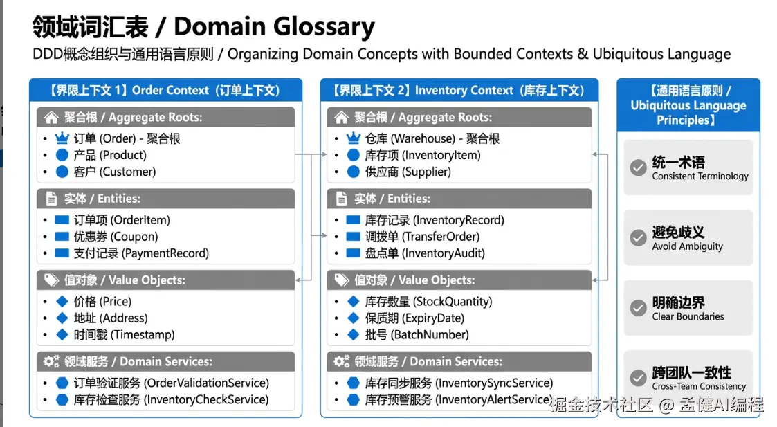 在领域驱动设计(Domain Driven Design)的思想中,我们需要先制定团队通用语言,语义的重要性体现在界限上下文(Bounded Context)中,一个团队只有统一了语言概念基础,划分了清晰的边界,才能更好的沟通协作。
