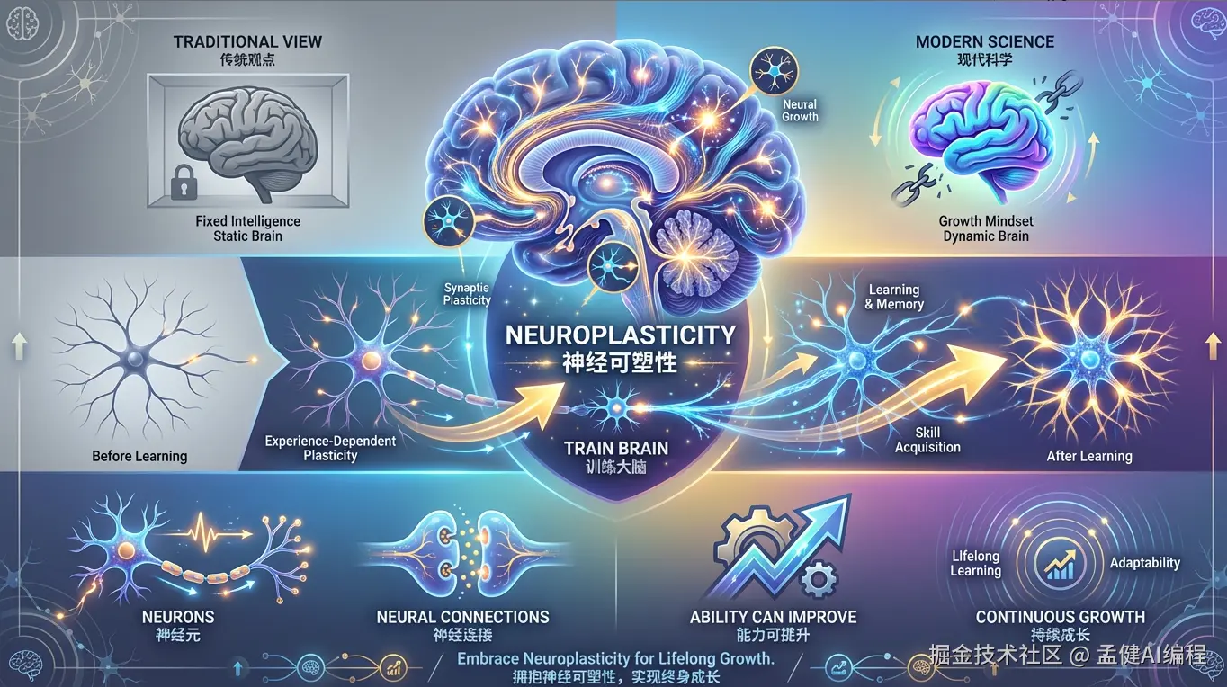 随着思考力和能力水平的提升,我们的大脑会得到重塑,天赋、智商并不是在出生那一刻就被决定了的,而是可以通过学习、锻炼、挑战不断提升的,因此我们应该秉持“终身成长”的信念。